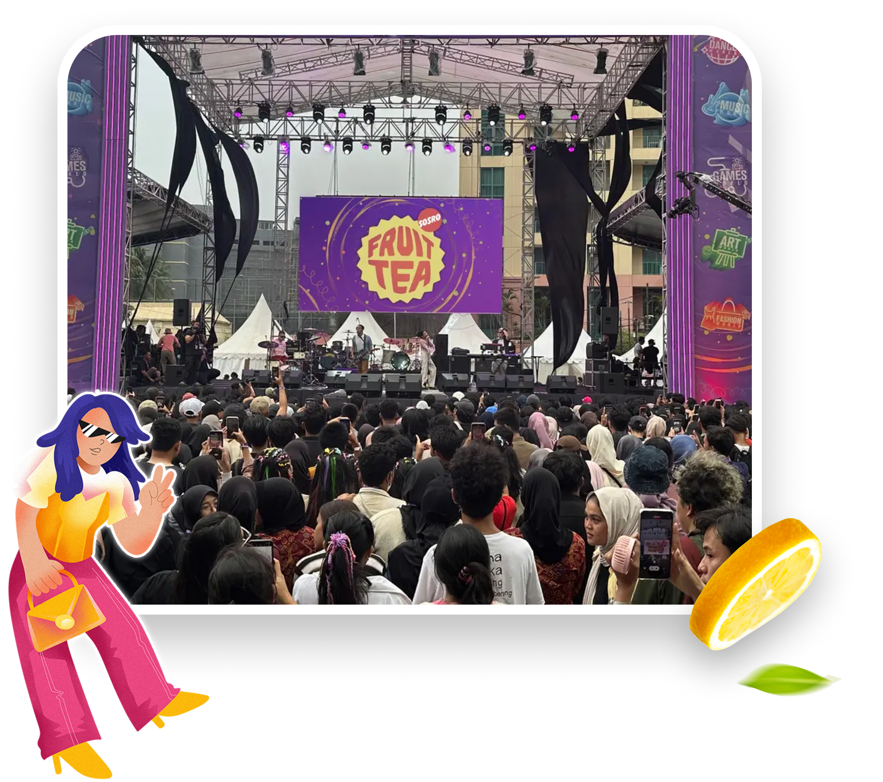 Fruit Tea World Festival (FTWF) adalah sebuah tempat dimana lo bisa menyalurkan setiap bakat dan kemampuan yang lo punya sesuai 5 pillarnya Fruit Tea (Music, Dance, Art, Fashion, and Games) dan tahun ini kita muncul dengan tema “Blend The Vibes” dimana lo bisa nunjukin vibes lo secara maksimal dan ngeblend bareng di Fruit Tea World Festival!
